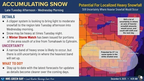 Door and Kewaunee counties are expected to become a winter wonderland to kick off the week after the National Weather Service issued a winter storm watch Monday morning. The winter storm watch, which also affects Calumet, Manitowoc, Winnebago, Brown, Outagamie, and southern Oconto counties, is in effect until 9 a.m. Wednesday, with an expected snow accumulation of four to seven inches.
