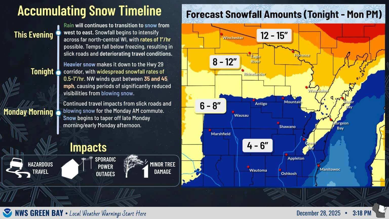 While snowfall will taper off later in the day, dangerous travel may continue due to strong winds, which will reduce visibility and make roads slippery. High winds and heavy snow may also bring down trees and power lines throughout the area.
